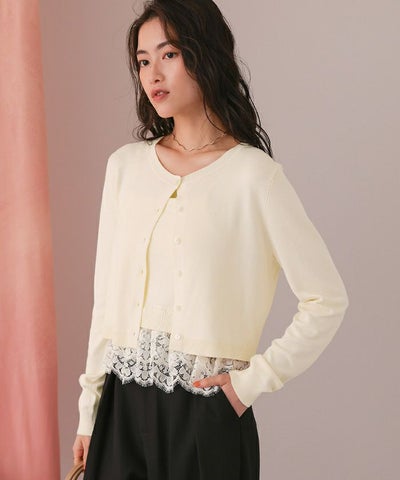 ・カーデはリラクシーなシルエットで、コンパクトすぎず、抜け感を演出。ボタンを留めれば裾からレースが覗く上品なルックに