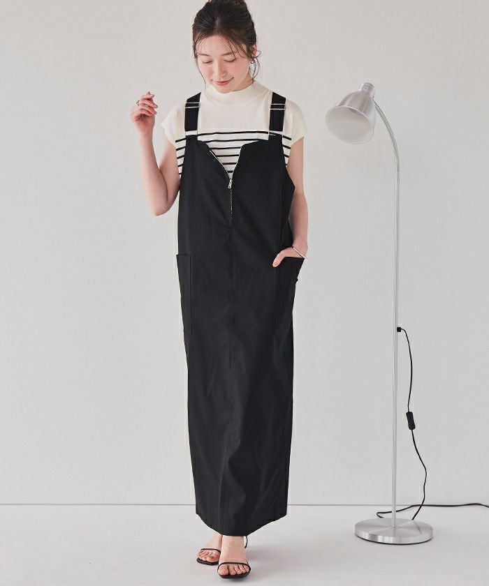 ・フロントをジップで開け閉めできる、デザインジャンパースカート。ジップを開けて垂らして着ても、閉めて着ても◎着こなしを気分で楽しんでいただけます。