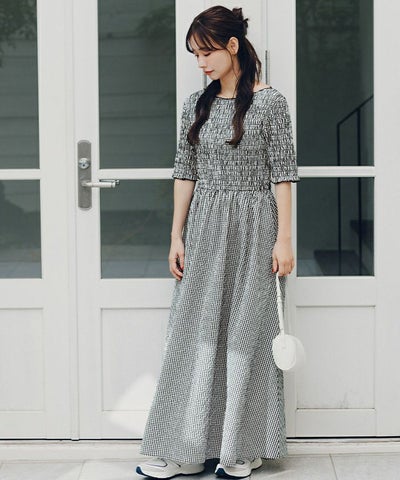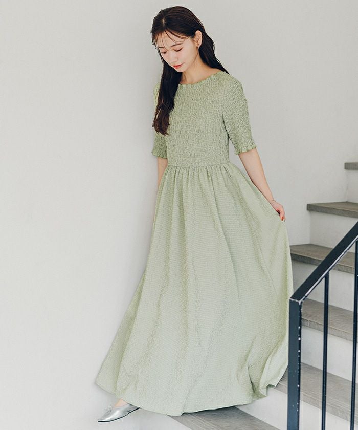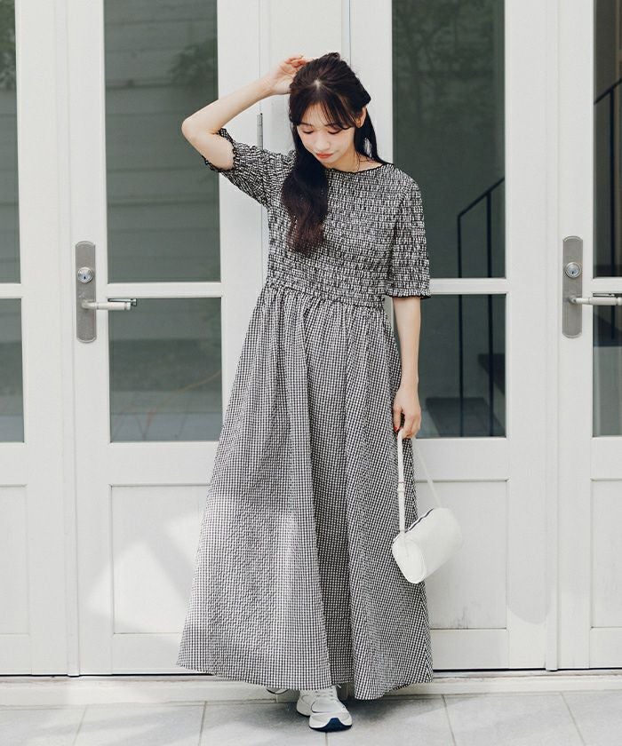 ・全方位から華奢見えが叶うシャーリングデザイン。シンプルなのに“一枚で絵になる”主役級ワンピース。