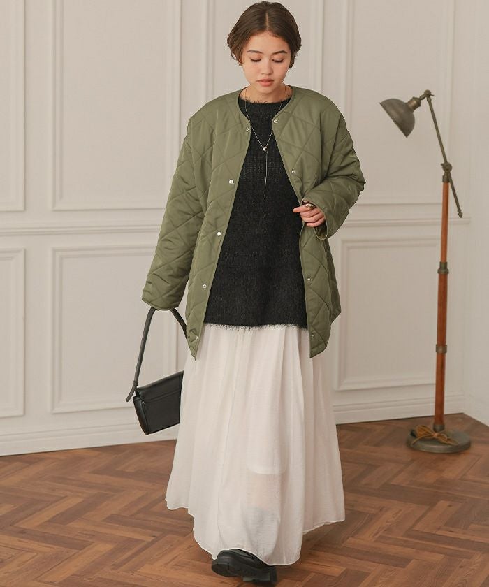 保育園の送り迎えにパッと羽織れる上着を探していました! 中綿で軽いのに暖かいです。ノーカラーなので真冬はマフラーもしやすそうです。