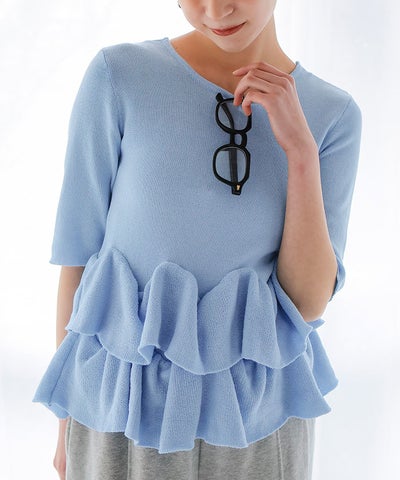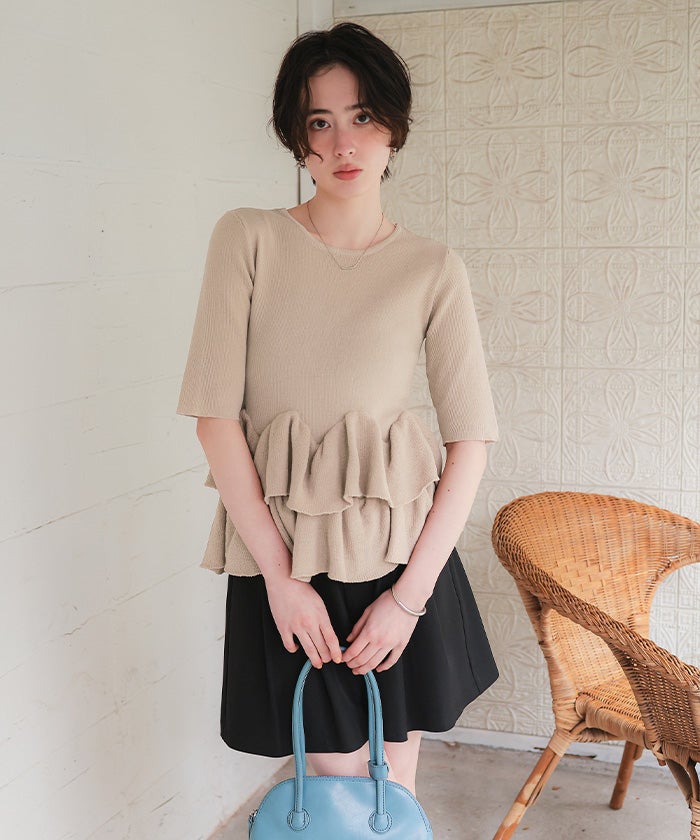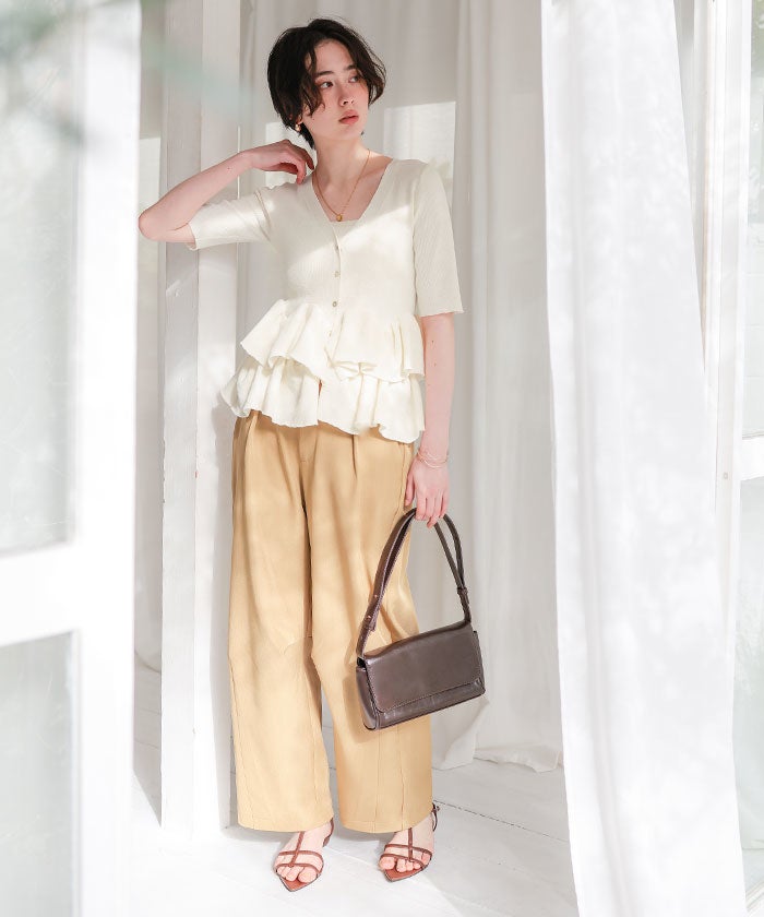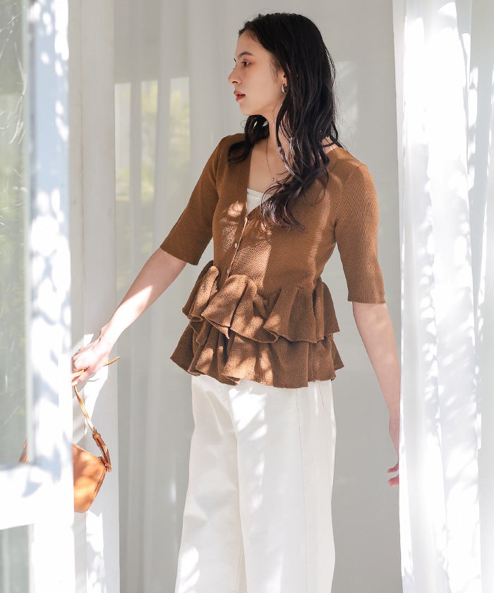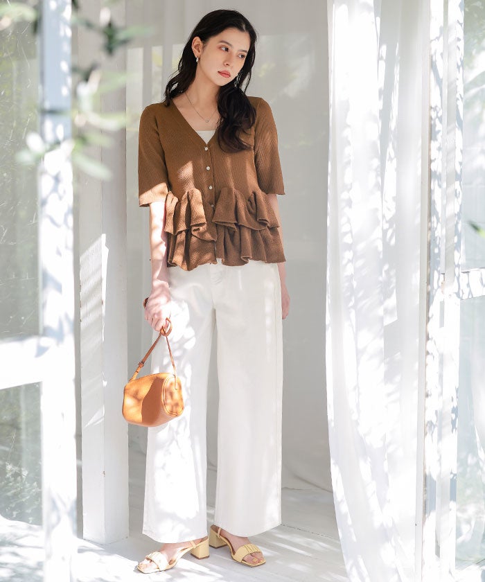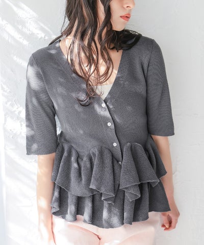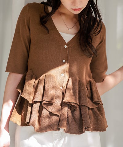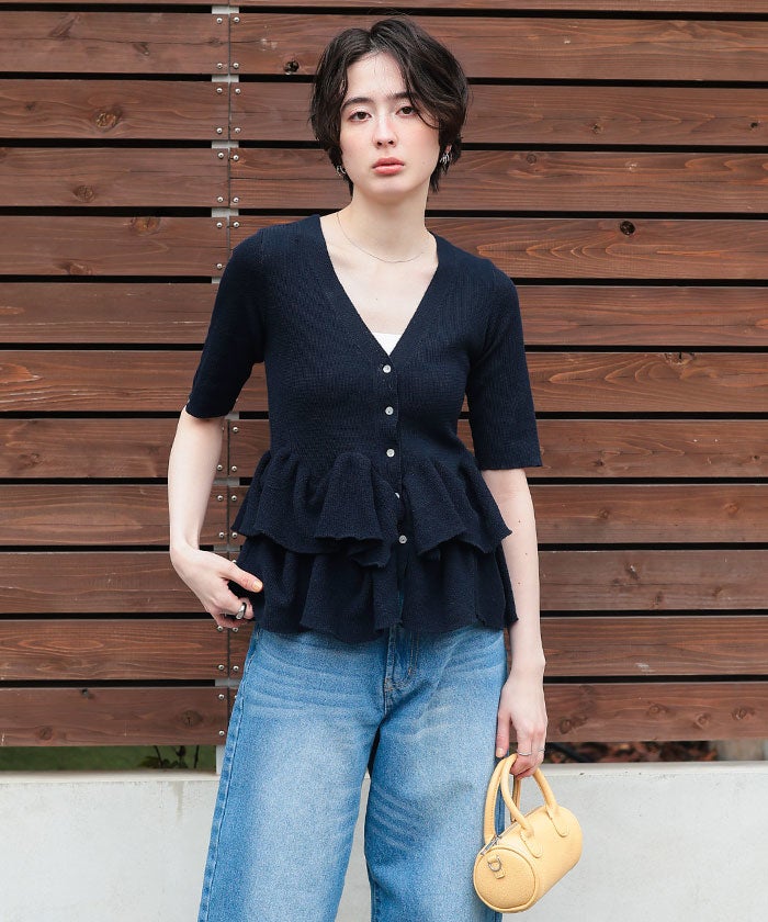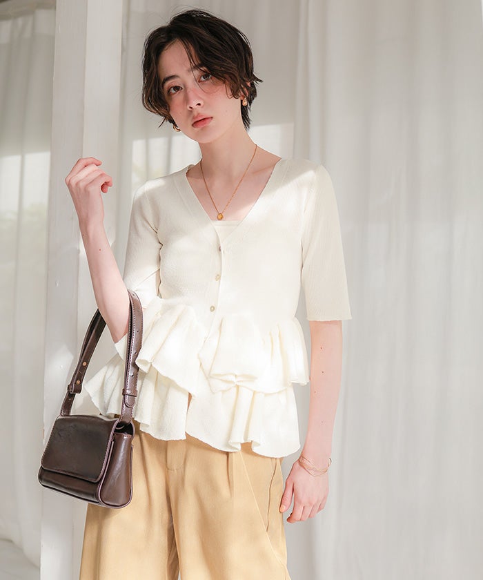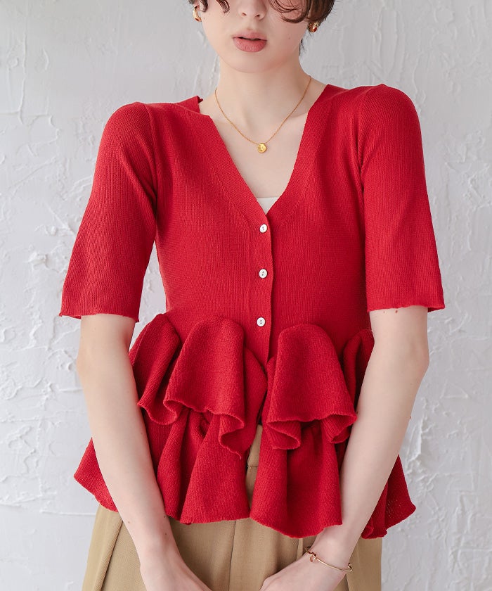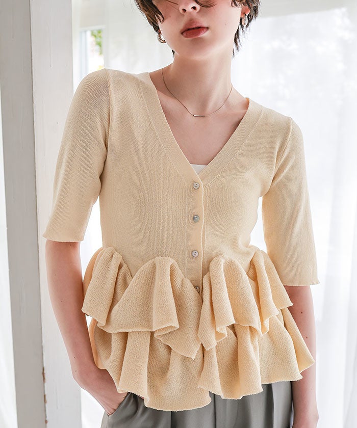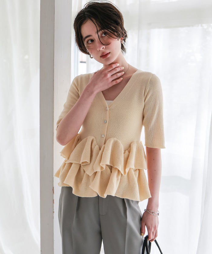 ・ランダムフリルヘムが目を惹く半袖ニットカーディガン