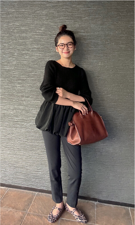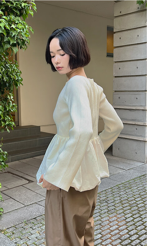 ペプラムデザイントップスには、ストレートパンツを合わせたシルエットが好き。全体のカラーバランスもお気に入りです。