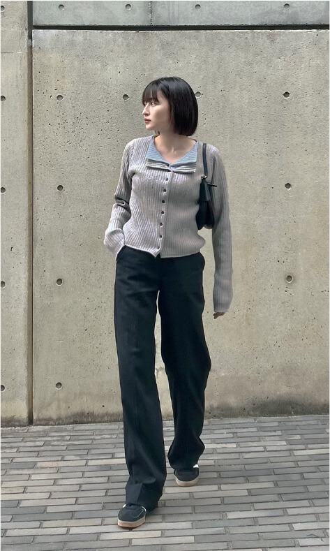 ニットを主役に、シンプルなスラックスを合わせて、足元はスニーカーで抜け感をプラス。 柔らかなカラーを引き立てるよう全体をベーシックトーンで統一しました。