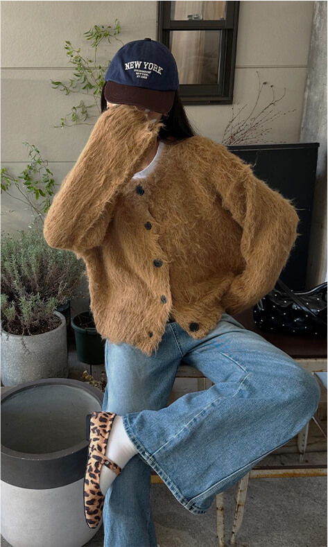 カジュアルにデニム&キャップを合わせつつ、足元はレオパードシューズで遊び心をプラス。最後のボタンを外すことで、ウエスト位置を高く見せ、スタイルアップします◎