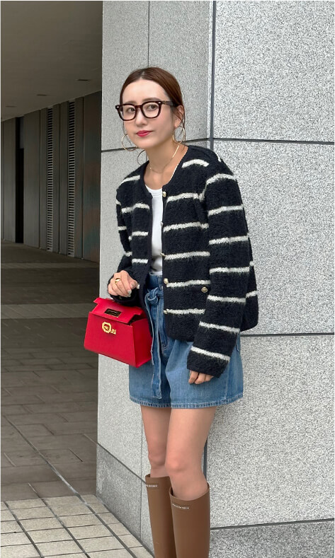 ボタンを閉じてトップス使いもできるので、気分に合わせてアレンジできるのが◎ゴールドボタンをポイントに、小物はシンプルにまとめて、トップスが主役のコーデにしました。