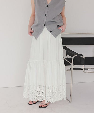コットンレースが軽やかでステキです。 刺繍部分はボリュームたっぷりですが、切り替えになっているので上部の腰回りは広がり過ぎずに履けます。 少し透けが気になるので、ベージュのペチパンツを着用しています。