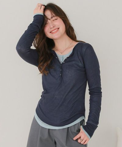 スッキリ着られるヘンリーネックトップス! シアートップスを重ね着して レイアードすると 凄く可愛いたです! 色違いが欲しくなりました!