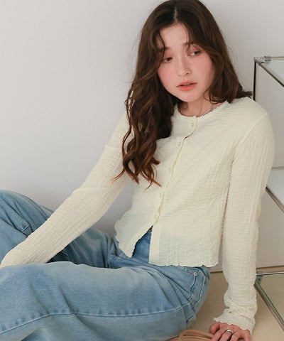 かなり薄手で、ボコボコとした生地です。 写真より白っぽいブルーでした。 一枚で着るより、軽く羽織るのに適しています。