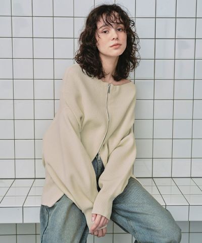 スポンジっぽい素材のニットです。 オーバーサイズなので、ゆるっとかわいく着用出来ます。 オフショルにしたり、ネック部分を襟のように折り返してみるのも良さそうです。 ダブルジップで色々な着こなしが楽しめそうです。
