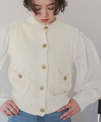 ゴールド釦ツイードニットベスト
