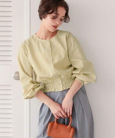 クルーネック裾シャーリングブラウス【メール便可/100】