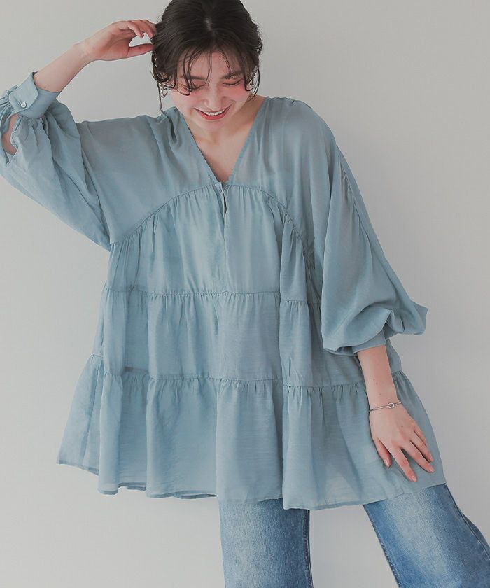 デニム×白ブラウスは間違いない! 肩のフリルと襟元が女性らしくてかわいい! -